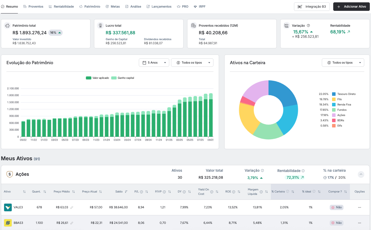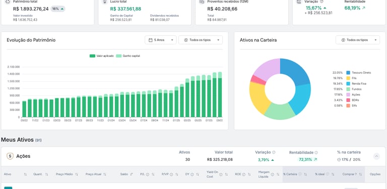 Alocação inteligente entre ativos como renda fixa, ações, fundos, previdência e outros